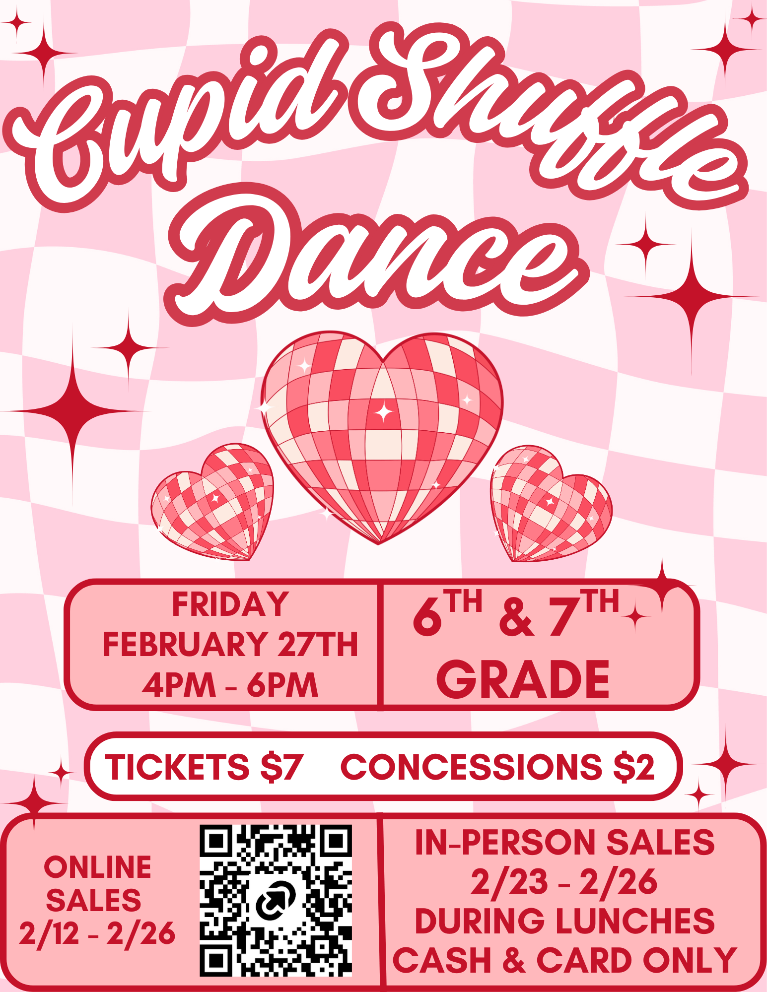 Get ready to dance the night away at the Cupid Shuffle! This 6th & 7th grade dance will be packed with fun — great music, a photo booth, concessions, giveaways, and plenty of time to hang out with friends. Grab your crew and join us for a night you won’t want to miss!